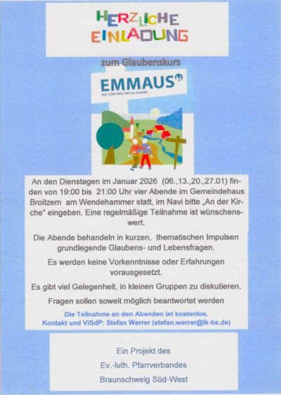 An den Dienstagen im Januar 2026 ( 06., 13., 20. und 27. Januar) findet jeweils von 19:00 bis 21:00 Uhr ein Glaubenskurs im Gemeindehaus der Versöhnungskirche in Broitzem, An der Kirche statt. Eine regelmäßige Teilnahme ist wünschenswert.