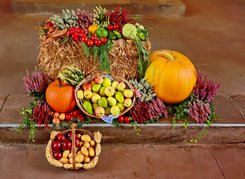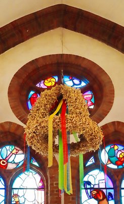 Nachdem die Erntekrone, die ursprünglich von Ernst Knüppel gestaltet wurde, in die Jahre gekommen war, wurde sie im Jahr 2020 von Frau Rühmann, Frau Oppermann und Frau Meier neu hergerichtet. Wie in jedem Jahr wurde sie im Altarraum aufgehängt. Vor dem Altar wurde ein Konvolut von verschiedenen Früchten auf einem Strohballen arrangiert. Auf dem Foto sieht es aus, wie das Gemälde eines berühmten Malers.
